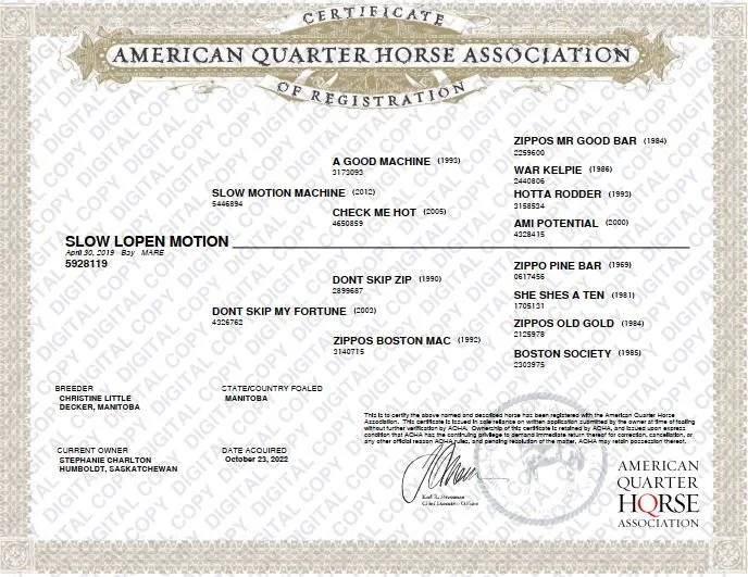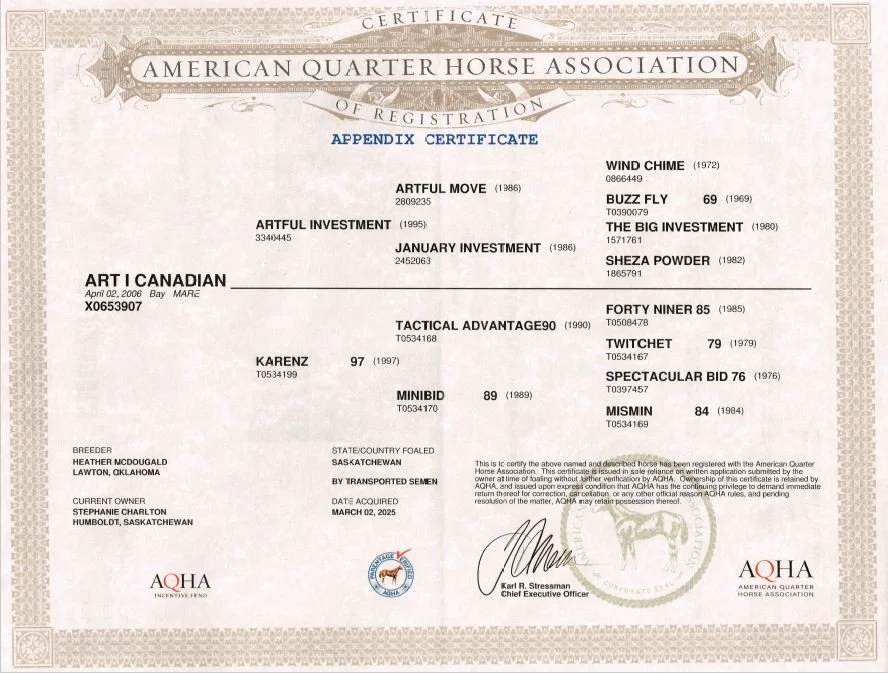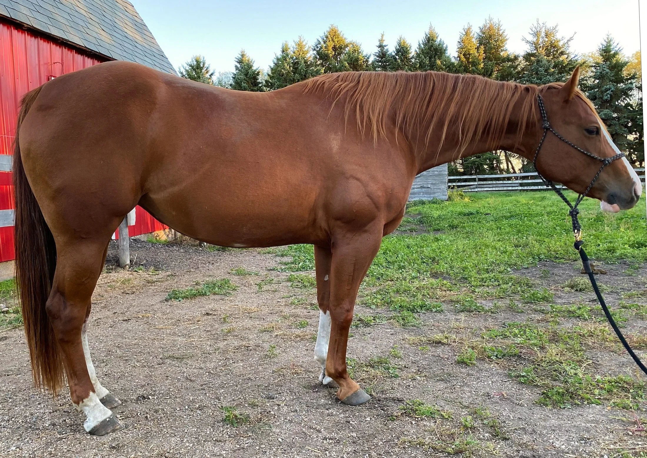 Krissy was purchased from the Little Valley performance horse program as well. A big mare at a solid 15.3 H. She has an extremely strong maternal line, the dam having produced point earners. Slow Motion Machine was a young stallion that produced some point and money earners with just a few foal crops.