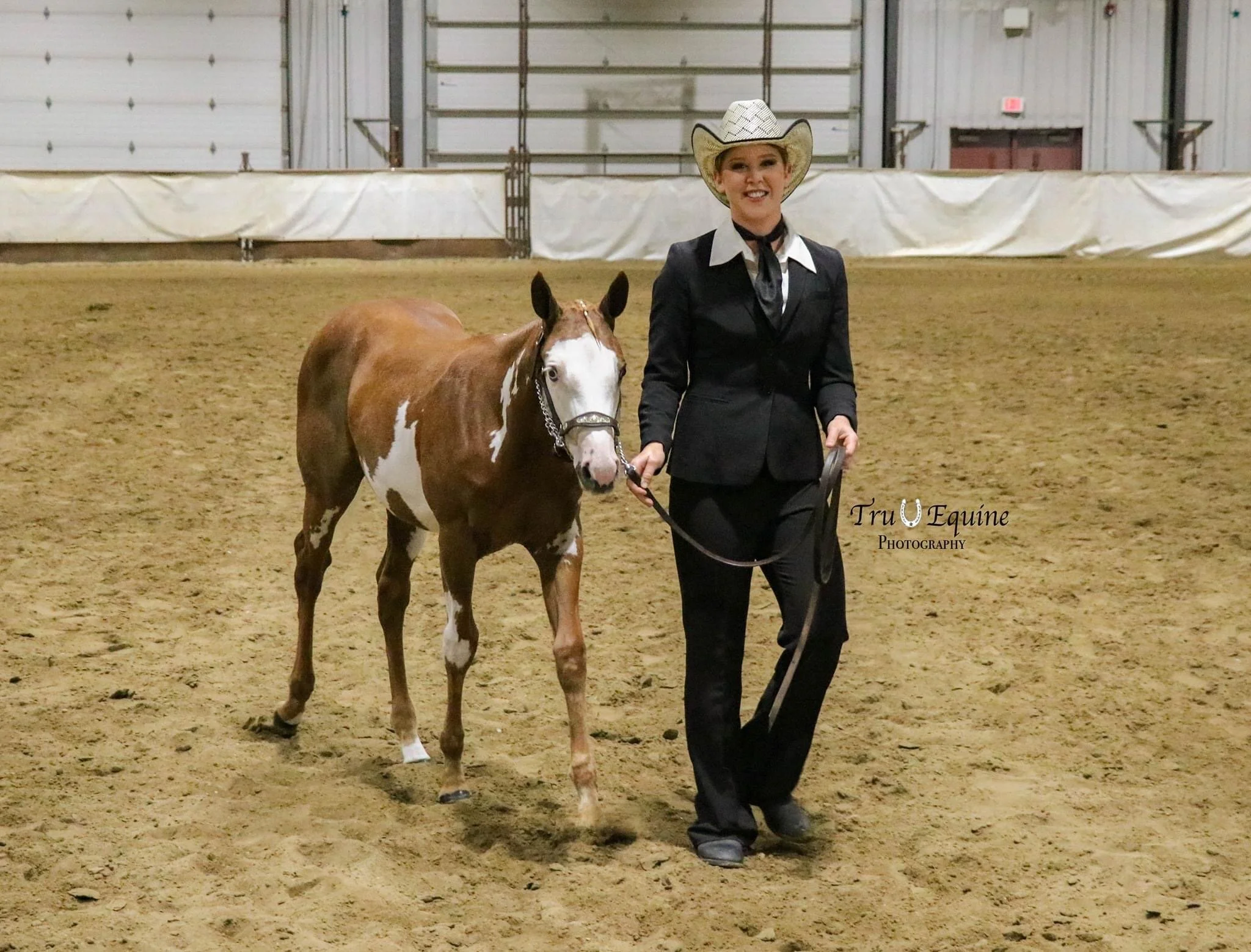 He was shown by Stephanie during his yearling year. They won the APHA Zone 10 yearling high point non pro award and Christmas in September Reserve champion in the in hand trail and 3rd in longeline - in a class of 19 yearlings!