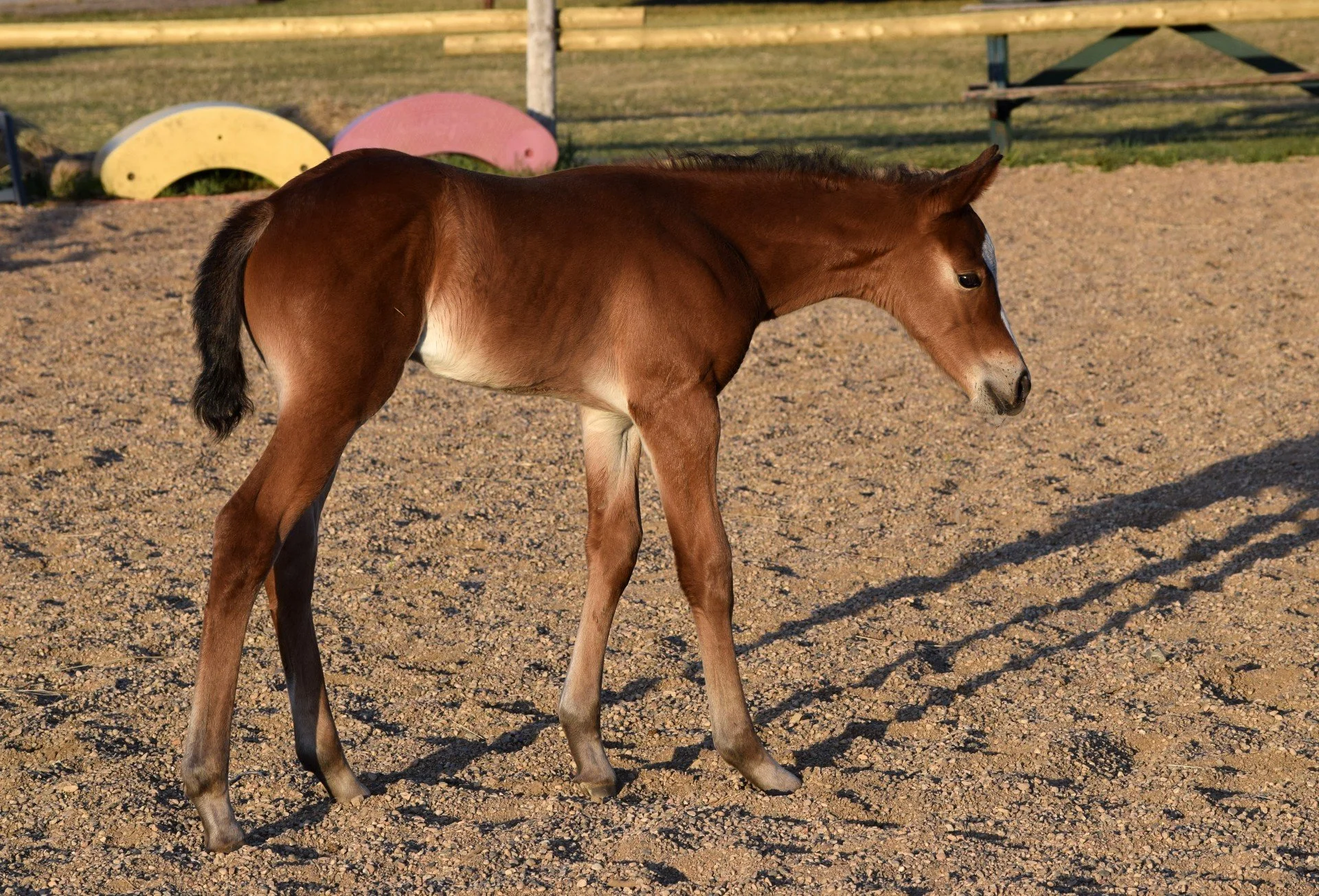 “Roxy” is the first foal for this mare, and boy she hit it out of the park. Pretty head, nice topline and great color.